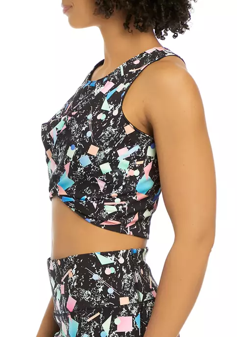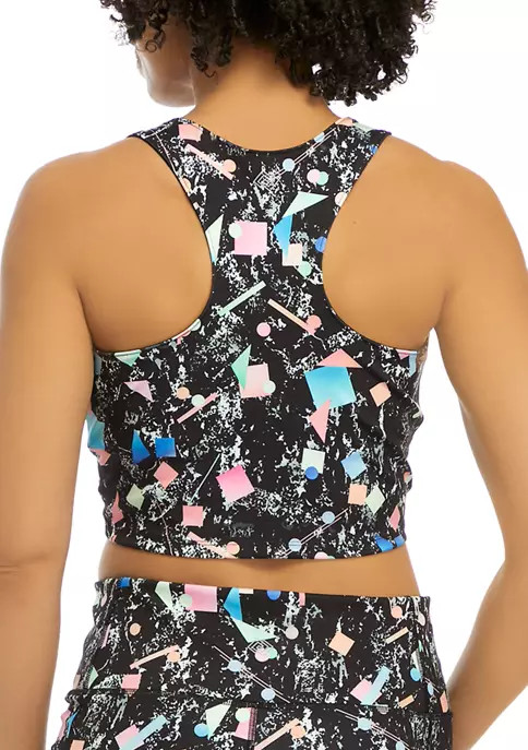 A colorful geometric print pops on this longline sports bra from ZELOS, featured in a cropped silhouette with a twist front detail.