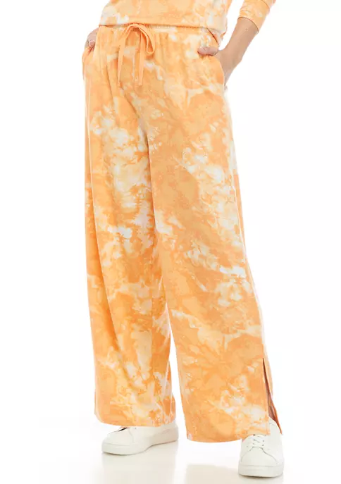 Splits at the hem garnish the wide-leg cut of these pants that are covered in a prominent tie-dye print.